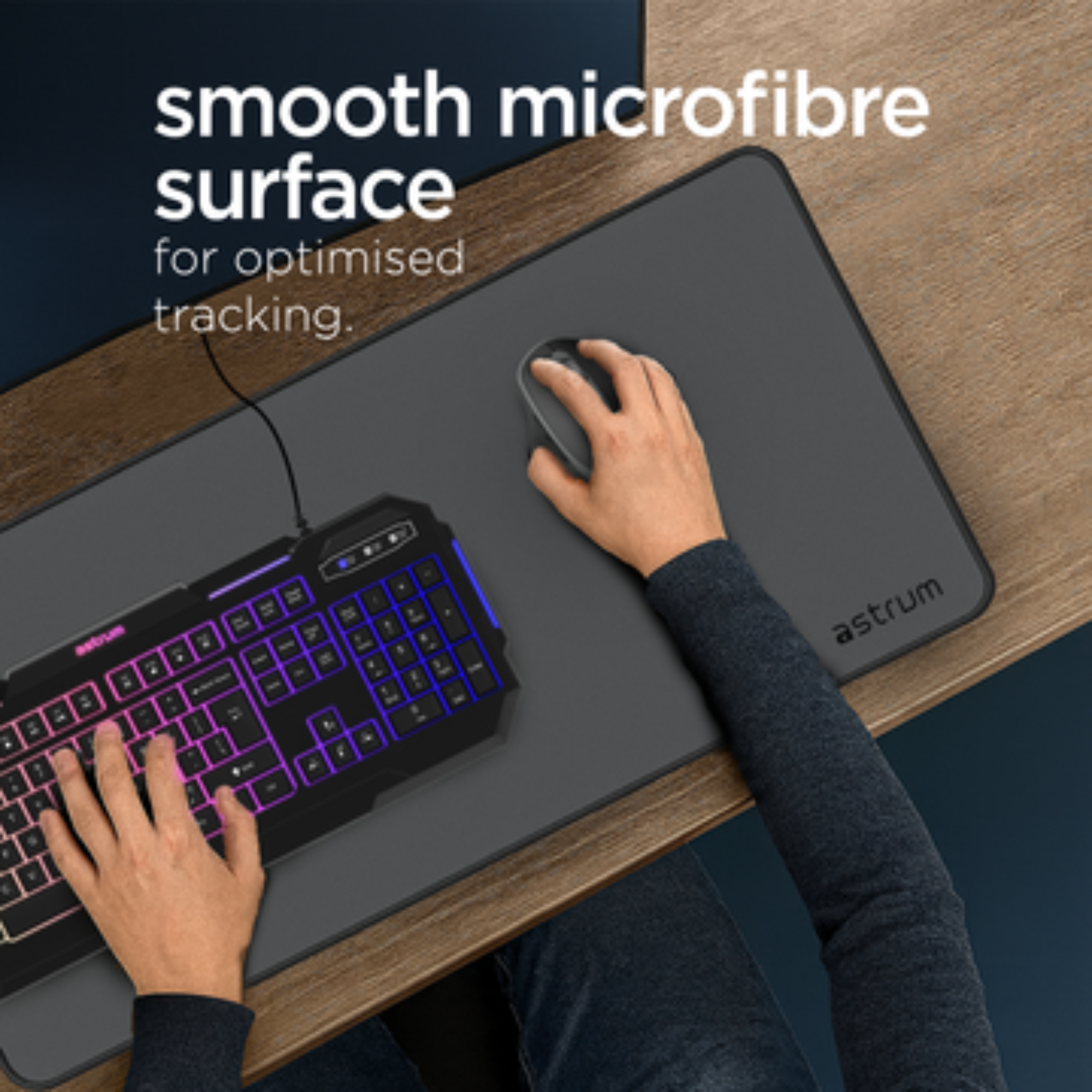Enhance your setup with the Astrum MP730G Gaming Mouse Pad, designed for users who demand comfort, control, and durability. Its spacious 70x30cm size fits both keyboard and mouse with ease, while the ultra-smooth microfibre surface ensures precision tracking. With 4mm of soft cushioning, anti-fray stitched edges, and a spill-resistant coating, this pad is made to perform – whether you’re in the zone gaming or powering through a workday.